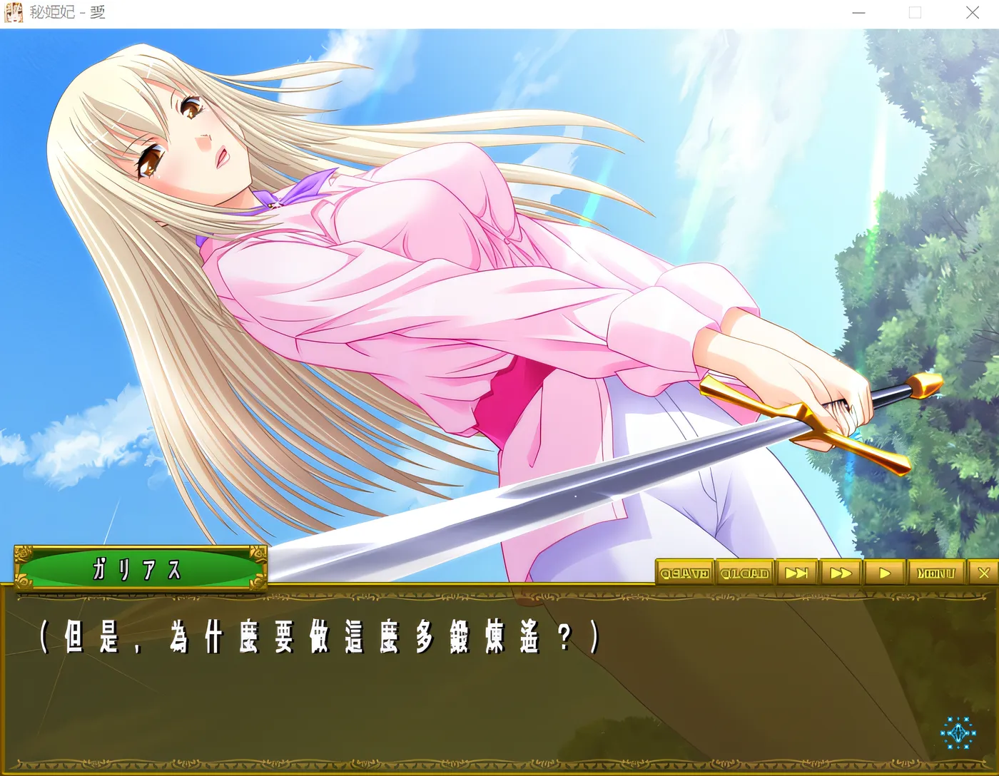在艾尔拉娜完成剑术训练之后,她在一处幽静之地低声呢喃着未婚夫的名字,同时触摸着她年轻而紧凑的下体。